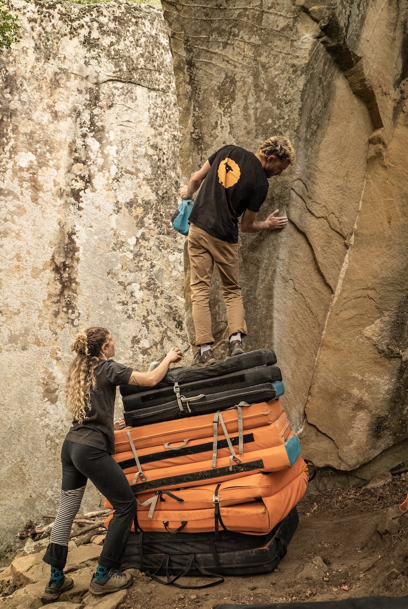 Esta foto nos gusta mucho y nos hace pensar en los primeros momentos; en particular, estábamos en Mangustaio (un lugar de escalada casi mítico en la historia de Brazz). Acabábamos de conocer a Raffo, visualizando movimientos y cayéndonos. “Deberíamos hacer nosotros mismos los crash pads”.